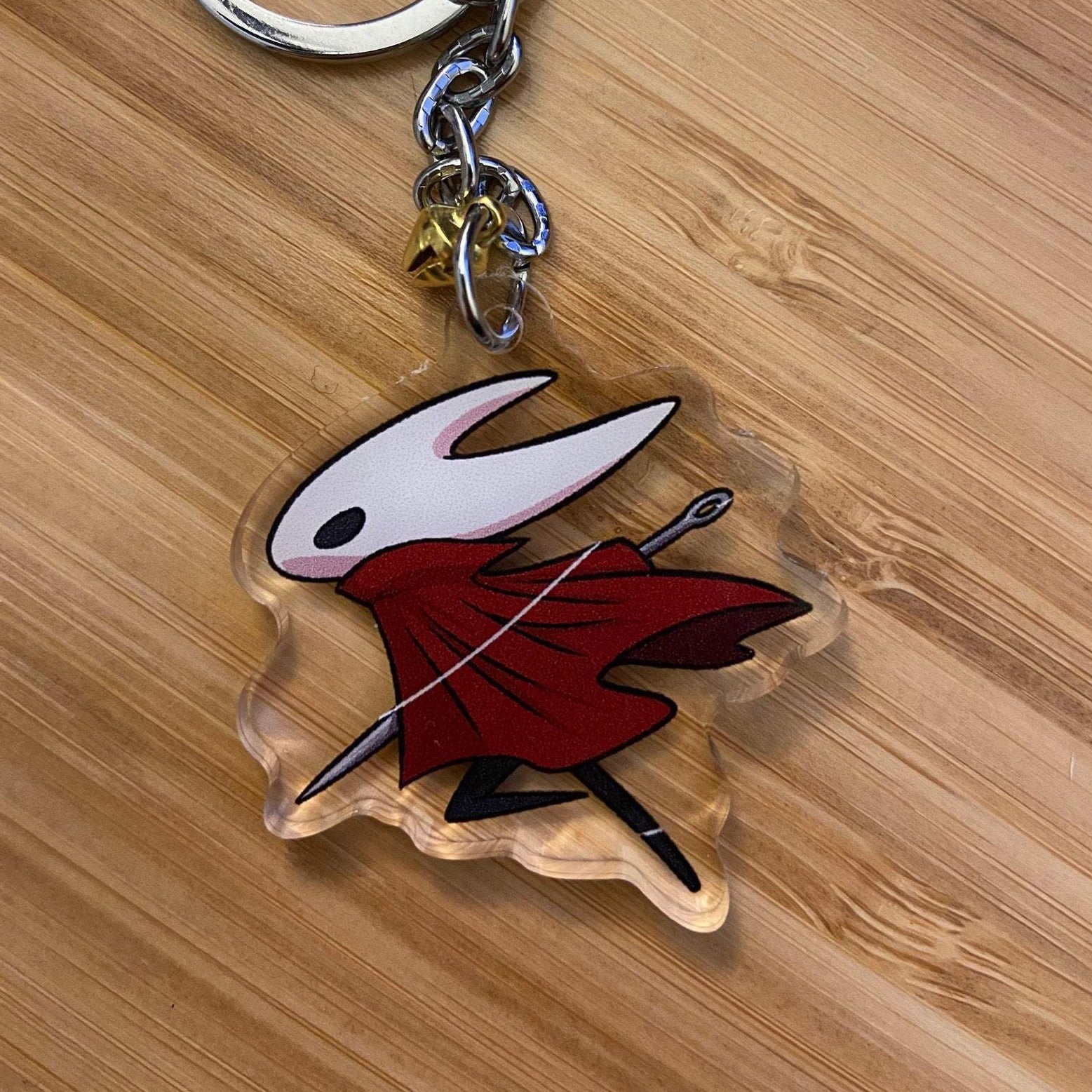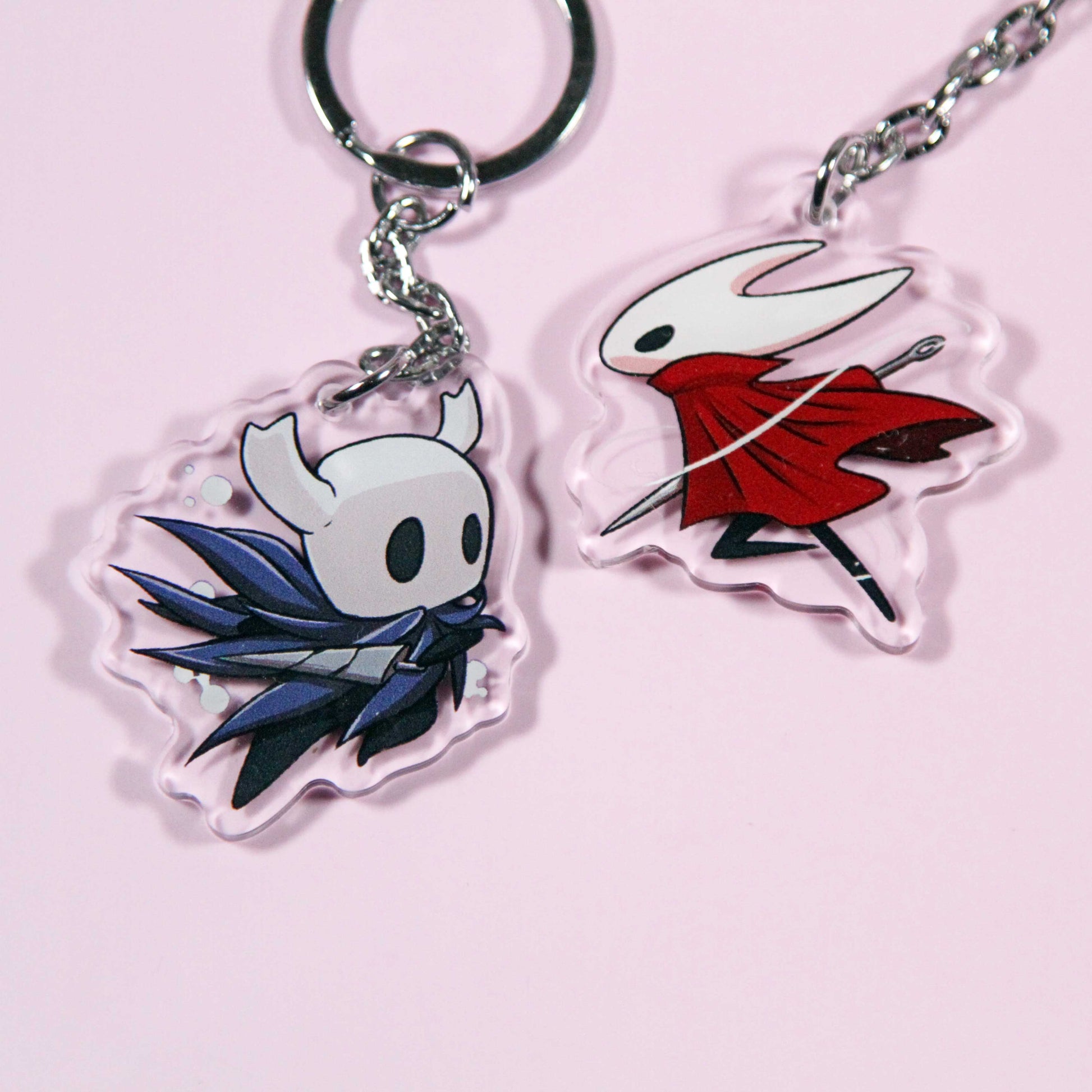 A 1.5 inch double-sided clear acrylic charm with artwork featuring Hollow Knight or Hornet from the Hollow Knight game.